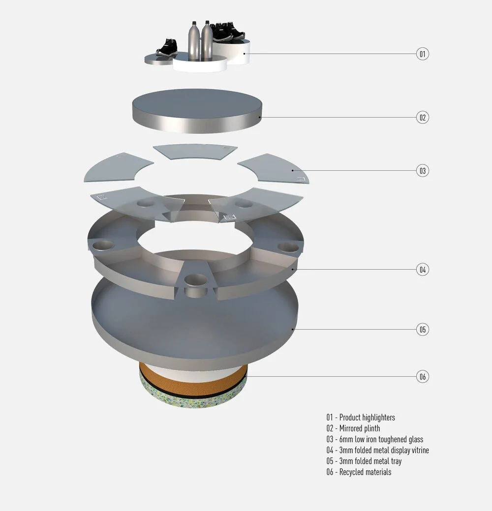 As part of the brief we were asked to elevate the women’s category and create differentiation from the men’s area. To achieve this we built a pallette of clay renders, brass and reeded glass to give the space a more boutique aesthetic and combined them with sustainable materials such as bespoke recycled terrazzo, locally sourced timber, sustainable fabrics and cork.